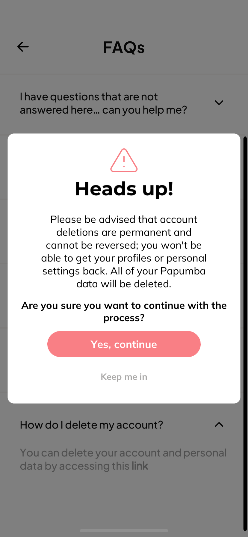 Para qualquer dúvida sobre a exclusão da conta ou sobre como lidamos com seus dados, entre em contato conosco em hello@papumba.com ou leia nossa íntegra Política de privacidade.