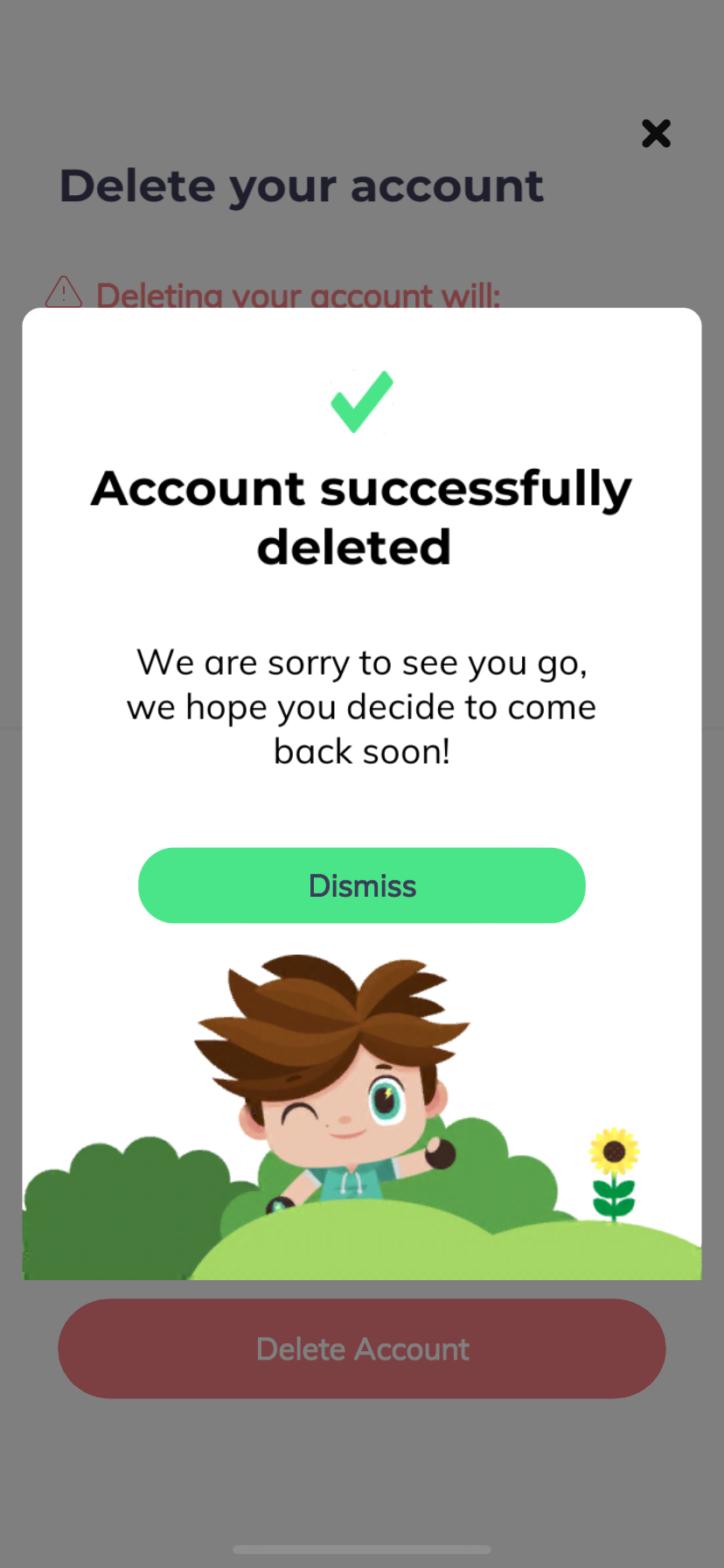 8. Sua conta será excluída imediatamente após você concluir essas etapas. Os dados associados podem levar até 24 horas para serem totalmente removidos.